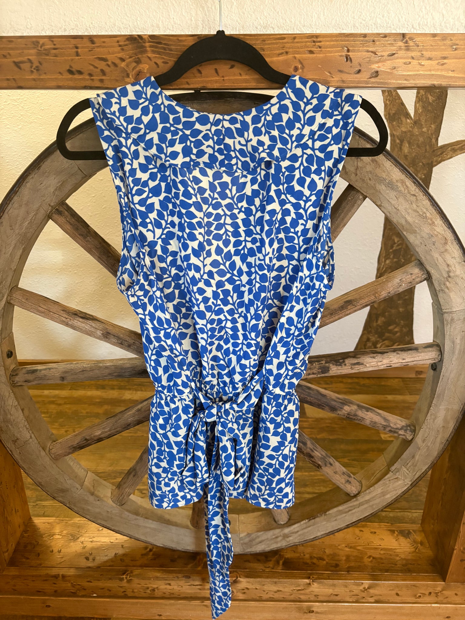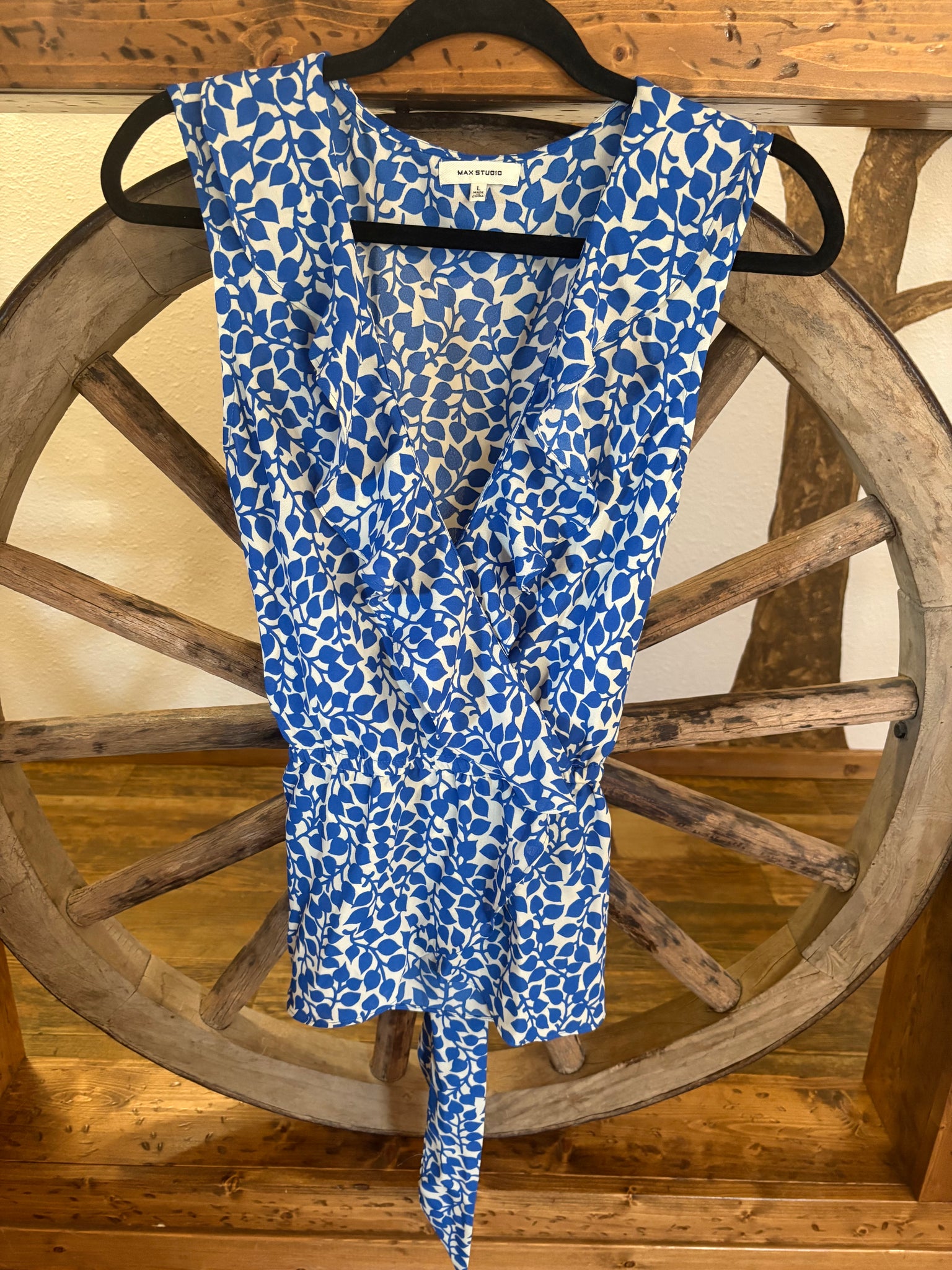 Max Studio, Sleeve less Blouse, V-Neck, Blue & White, Tie Waist, L